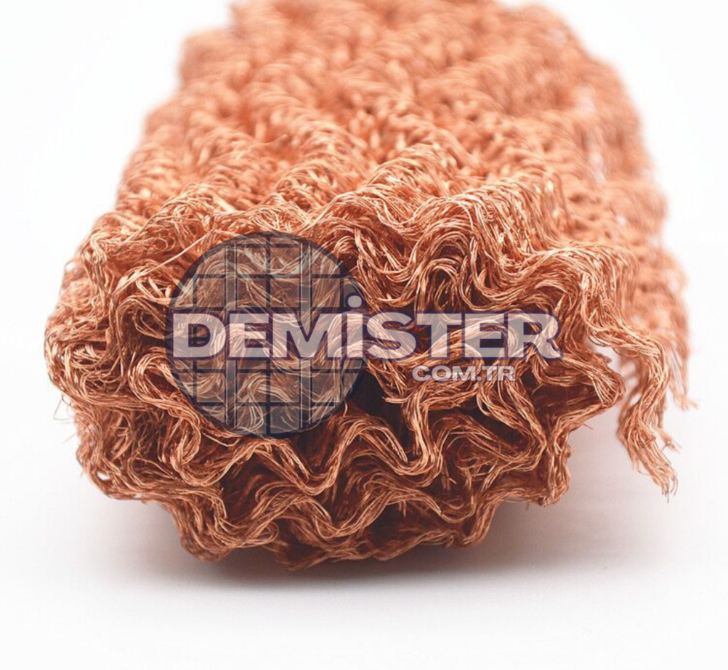 Bakır; yüksek elektriksel ve termal iletkenliği, yumuşaklığı ve lehimlenebilirliği ile öne çıkan iletken bir malzemedir. Yüksek erime noktası ve korozyona karşı direnci sayesinde birçok proseste tercih edilir. Bakır telden örülmüş demister, filtrasyon uygulamalarında etkin ayırma performansı sağlar.